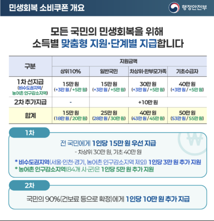 - 지원 방식: 전 국민 지급 + 소득·지역 조건에 따른 맞춤 지원